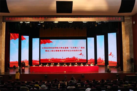 为进一步传承中华文明,推进校园精神文明建设,促进学校德育工作,培养学生文明守纪的良好习惯,12月11日,我校在音乐厅举行了《遵循“三元育人”理念健全人格以德修身文明守纪公约》动员大会。学校副校长吴朝栋及相关部门负责人出席动员大会,各学院党总支书记、团总支书记,学生代表等千余名师生参加大会。