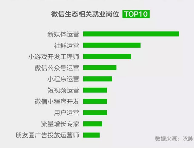 新媒体运营、社群运营、微信公众号运营、短视频运营等就业岗位为2019年微信生态相关职位前十位。文化传媒业为微信就业岗位行业分布榜单第四名。